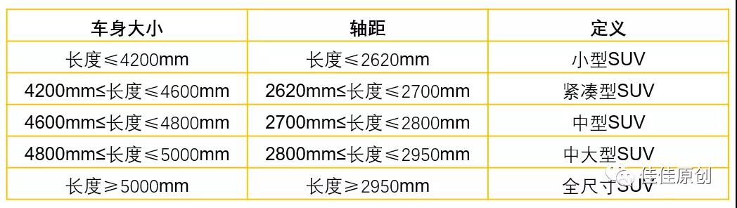 SUV(Sport Utility Vehicle,运动型多功能车),从我国汽车工业协会公布的销量数据来看,近些年SUV比较受消费者的喜爱。根据SUV的车身大小以及轴距的长度,可以将SUV分为:小型SUV、紧凑型SUV、中型SUV、中大型SVU、全尺寸SUV。如下表所示: